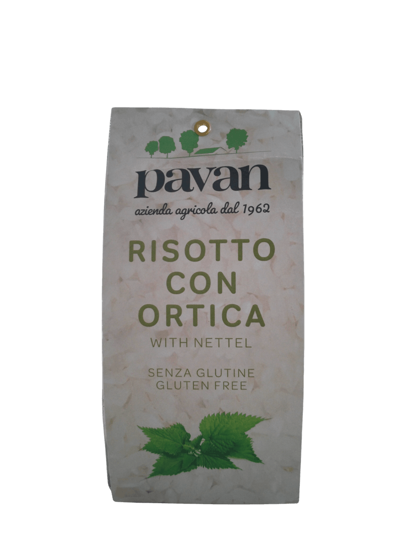 Ingredienti: Riso Carnaroli (91%), brodo vegetale granulare (sale, amido e maltodestrine di patate, verdure disidratate (carota, SEDANO, prezzemolo), olio di girasole, aromi naturali, spezie), ortica essiccata (2%), farina di riso. Preparazione: tostare il contenuto della busta in due cucchiai di olio, aggiungere a piacere mezzo bicchiere di vino bianco e lasciar evaporare, coprire con 750 ml di acqua calda. Cottura: 18 minuti circa. Mantecare a piacere. Dose per 3 porzioni.